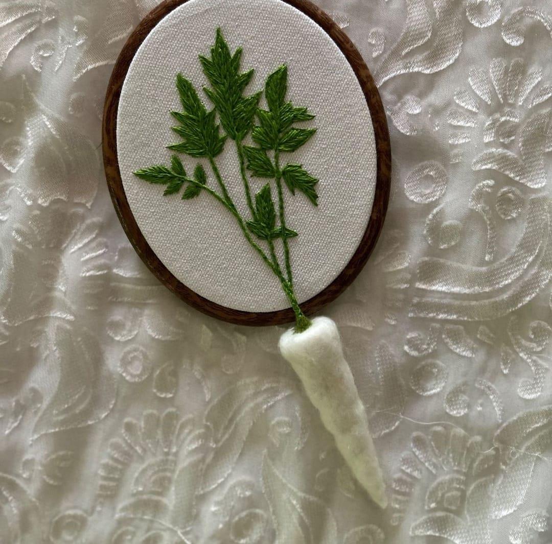 Most desired 3D embroidery; felted veggies hanging out from hoop. Available in embroidery frames size 3, 4, 5 and 5.5 inches. Pre ordered items are delivered within 15 days of receiving orders. International customers may custom order this item on our <a href="https://www.etsy.com/shop/TheCuteCottage2025"><u>Etsy Shop</u></a>